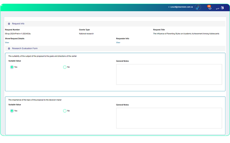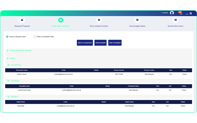 Access personal data of research teams and reviewers seamlessly, including contact information, curriculum vitae, and qualification summaries, fostering stronger connections within the research community.